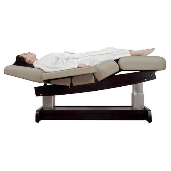The choice when positioning the client is the most important consideration. With its unique twin tower lift system, the table can be tilted in either direction. The tilting function is also helpful for many treatments.